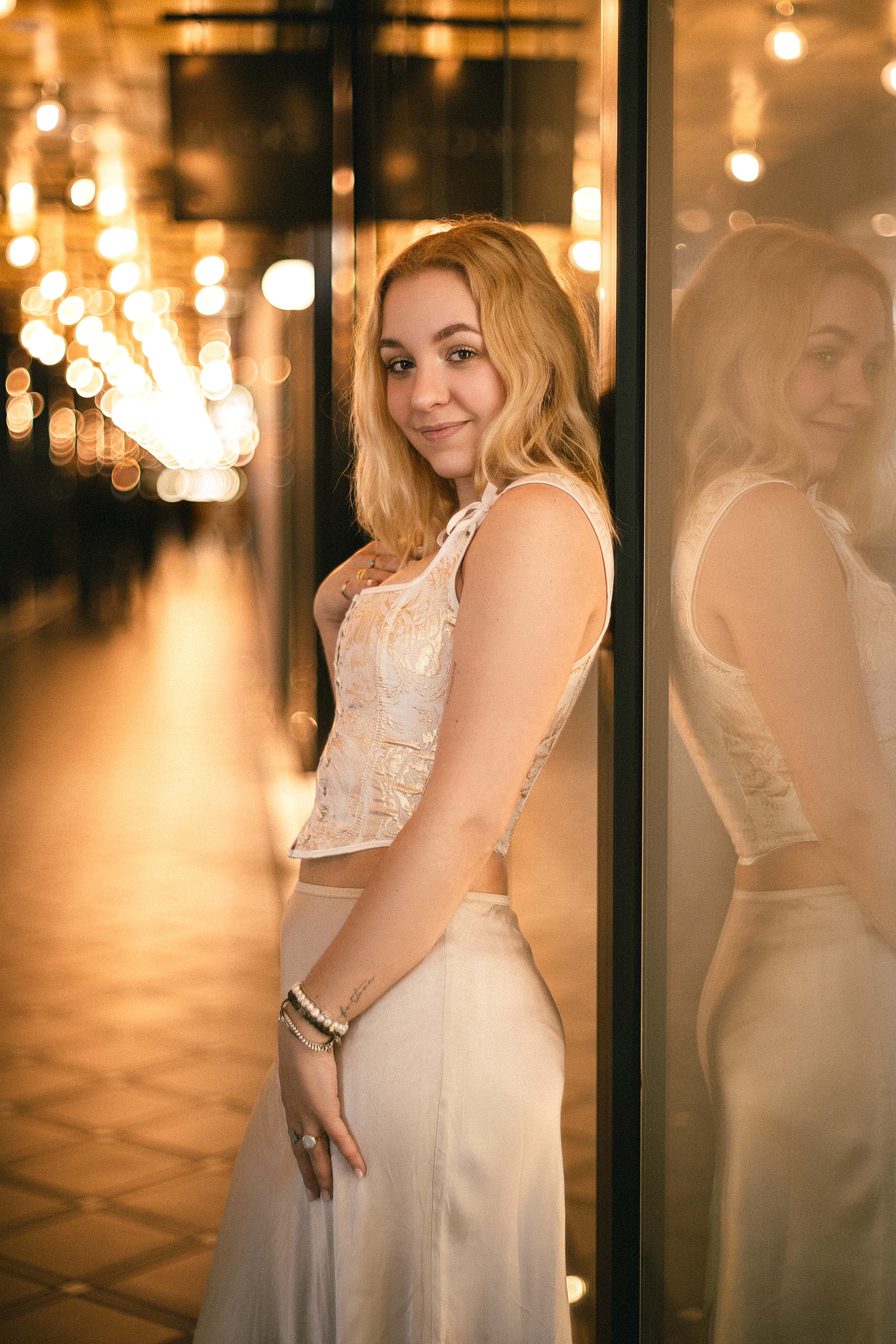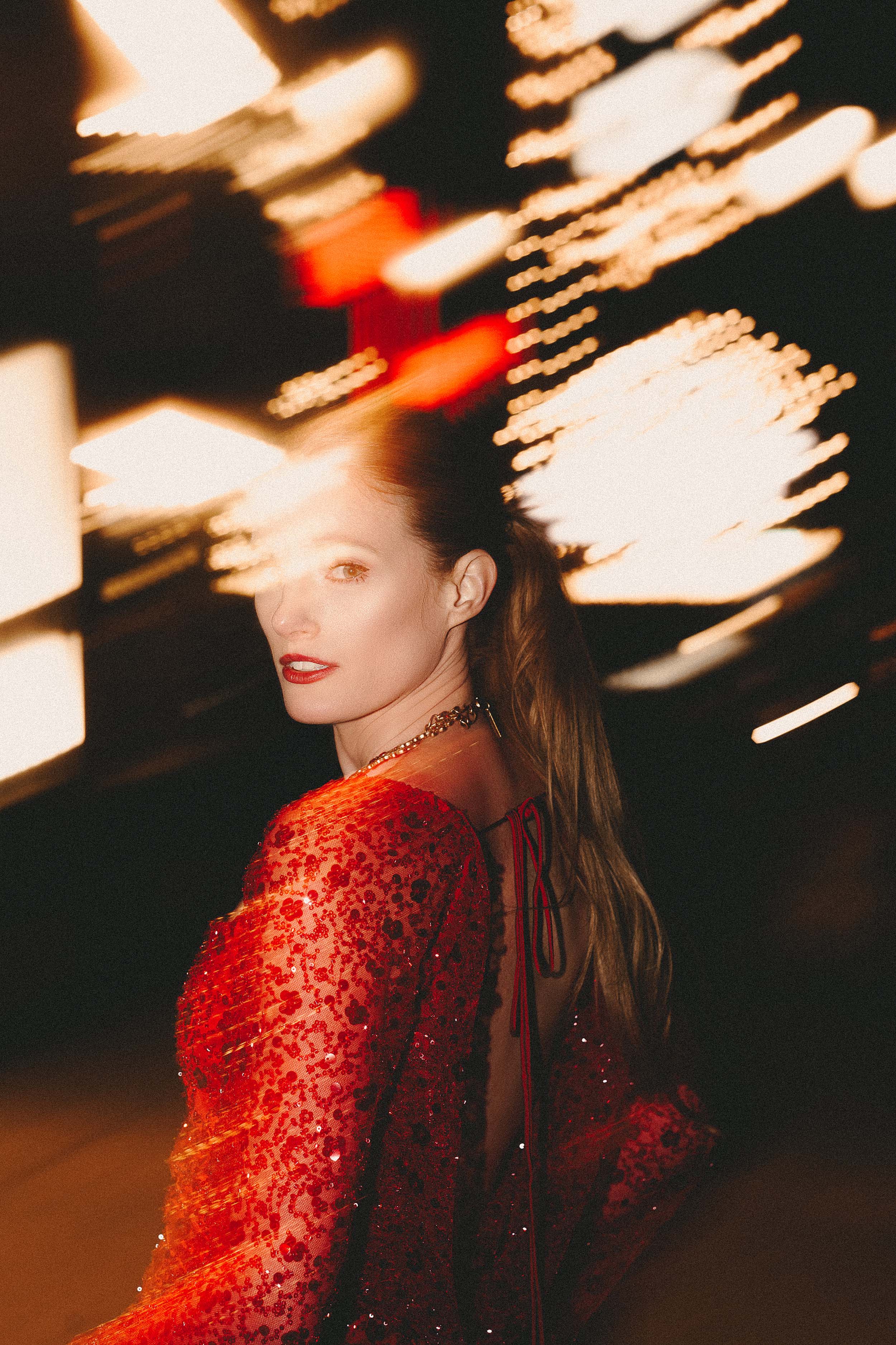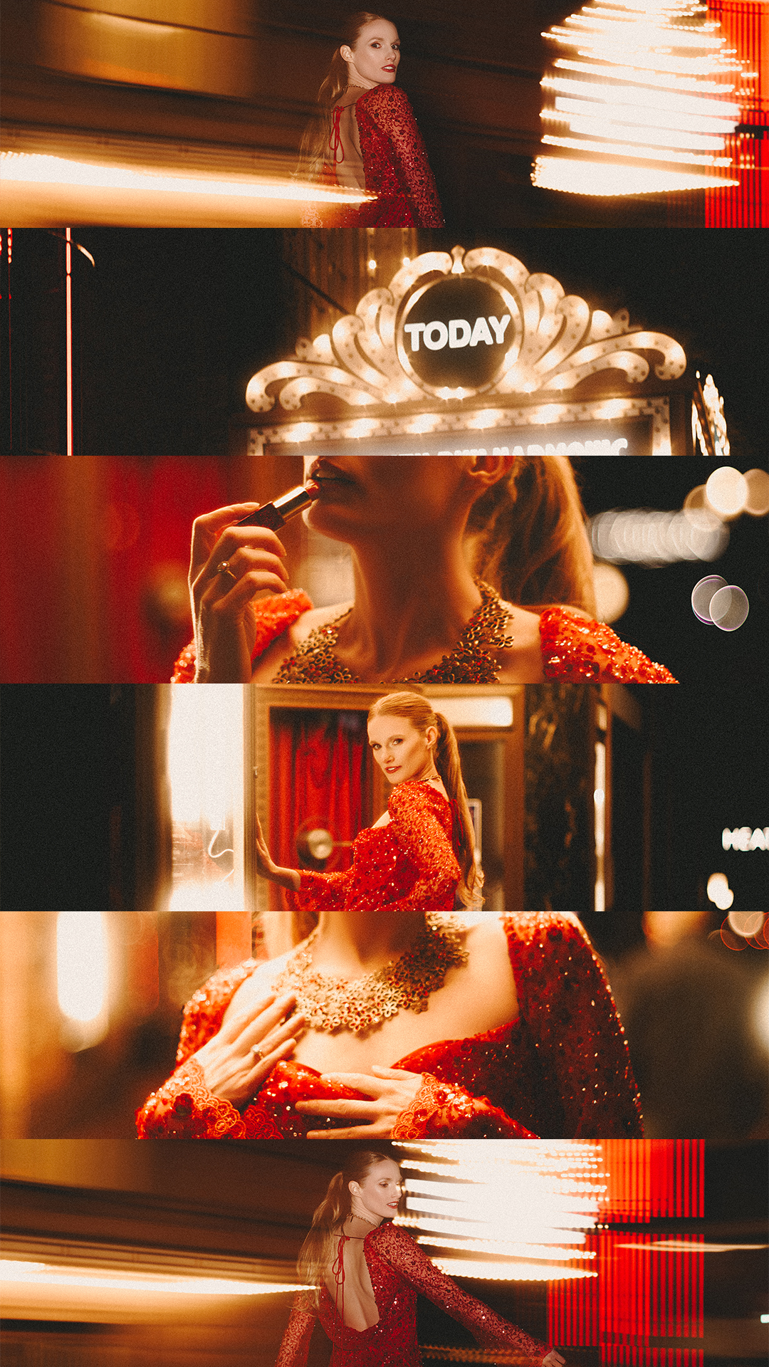 Imagine this. A fashion influencer at a premiere night of a renowned theater downtown. A red carpet-like atmosphere with a blend of luxury, art deco, and Old Hollywood...