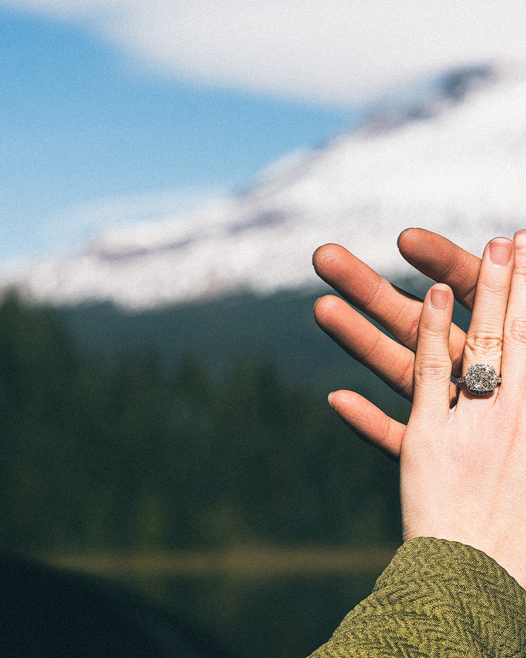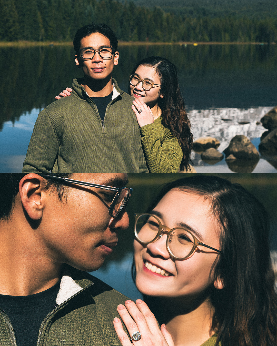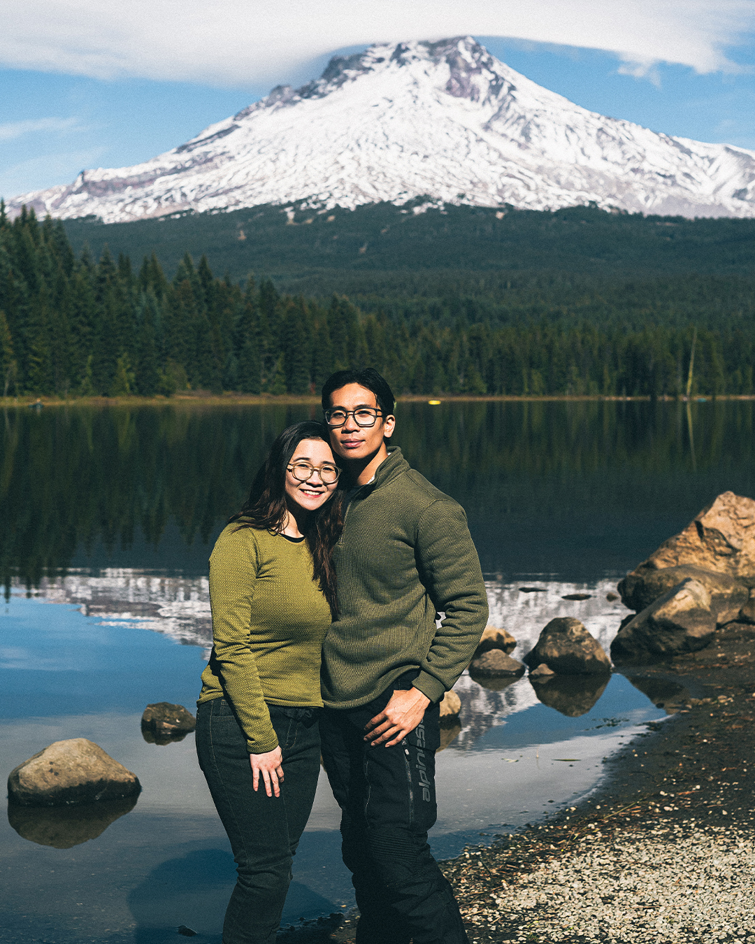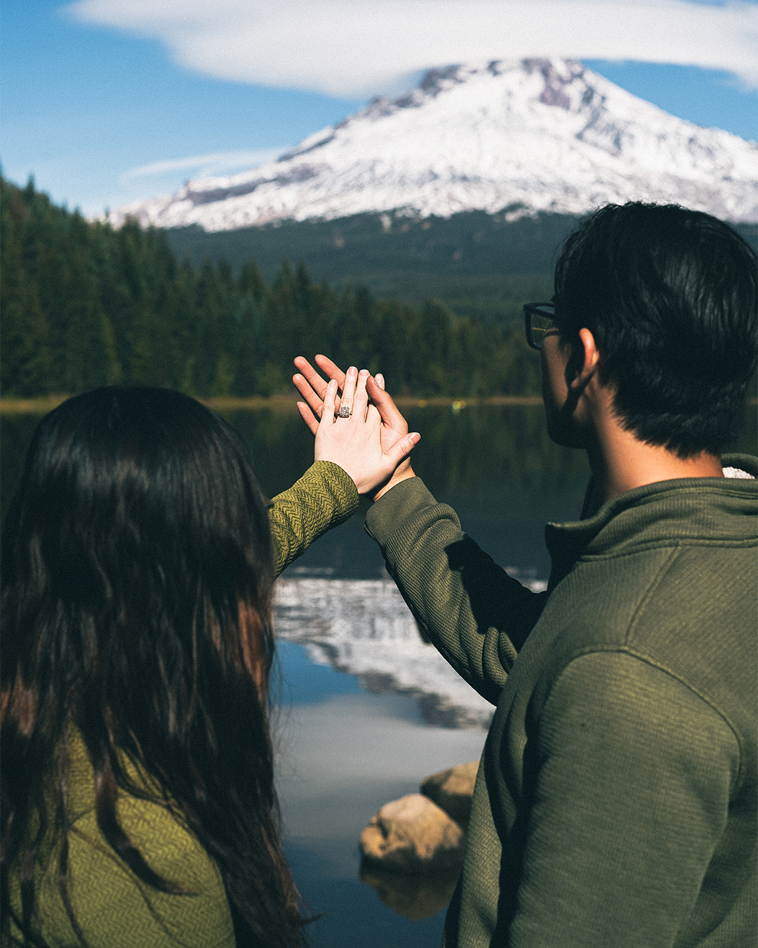 My client had the most wonderful and romantic idea to propose to his partner by Trillium Lake with some stunning views of snowy Mount Hood. While the weather in the fall around here is quite unpredictable, especially in the mountains, the morning of the proposal was perfectly beautiful. One of my client’s wishes was to capture Mount Hood in the background, and we were lucky to have it in almost all the pictures.